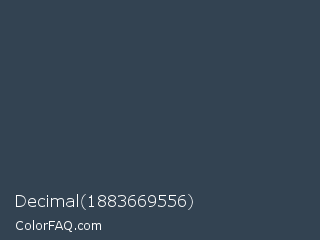 Decimal 1883669556 Color is a dark blue color and the nearest color is Charcoal #36454f. Hex code #334352 and RGB value is rgb(51,67,82). In RGB color space, this color is composed of 20% red, 26% green, 32% blue, In CMYK color space, this color is composed of 38% cyan, 18% magenta, 0% yellow , 68% black , In HSL color space, this color has a hue angle of 209° , 23% saturation and 26% lightness.