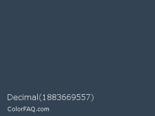 Decimal 1883669557 Color is a dark blue color and the nearest color is Charcoal #36454f. Hex code #334353 and RGB value is rgb(51,67,83). In RGB color space, this color is composed of 20% red, 26% green, 33% blue, In CMYK color space, this color is composed of 39% cyan, 19% magenta, 0% yellow , 67% black , In HSL color space, this color has a hue angle of 210° , 24% saturation and 26% lightness.