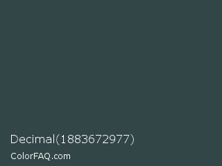 Decimal 1883672977 Color is a dark cyan color and the nearest color is Charcoal #36454f. Hex code #334647 and RGB value is rgb(51,70,71). In RGB color space, this color is composed of 20% red, 27% green, 28% blue, In CMYK color space, this color is composed of 28% cyan, 1% magenta, 0% yellow , 72% black , In HSL color space, this color has a hue angle of 183° , 16% saturation and 24% lightness.