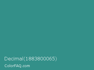 Decimal 1883800065 Color is a normal cyan color and the nearest color is Lochinvar #2c8c84. Hex code #339089 and RGB value is rgb(51,144,137). In RGB color space, this color is composed of 20% red, 56% green, 54% blue, In CMYK color space, this color is composed of 65% cyan, 0% magenta, 5% yellow , 44% black , In HSL color space, this color has a hue angle of 175° , 48% saturation and 38% lightness.
