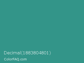 Decimal 1883804801 Color is a normal cyan color and the nearest color is Lochinvar #2c8c84. Hex code #339589 and RGB value is rgb(51,149,137). In RGB color space, this color is composed of 20% red, 58% green, 54% blue, In CMYK color space, this color is composed of 66% cyan, 0% magenta, 8% yellow , 42% black , In HSL color space, this color has a hue angle of 173° , 49% saturation and 39% lightness.