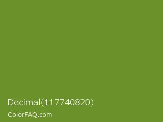 Decimal 117740820 Color is a normal green color and the nearest color is Olive Drab #6b8e23. Hex code #6b912a and RGB value is rgb(107,145,42). In RGB color space, this color is composed of 42% red, 57% green, 16% blue, In CMYK color space, this color is composed of 26% cyan, 0% magenta, 71% yellow , 43% black , In HSL color space, this color has a hue angle of 82° , 55% saturation and 37% lightness.