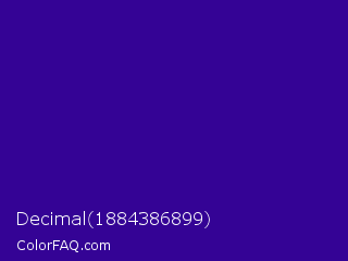 Decimal 1884386899 Color is a dark indigo color and the nearest color is Blue Gem #2c0e8c. Hex code #340395 and RGB value is rgb(52,3,149). In RGB color space, this color is composed of 20% red, 1% green, 58% blue, In CMYK color space, this color is composed of 65% cyan, 98% magenta, 0% yellow , 42% black , In HSL color space, this color has a hue angle of 260° , 96% saturation and 30% lightness.
