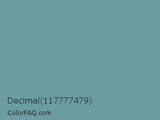 Decimal 117777479 Color is a normal cyan color and the nearest color is Desaturated Cyan #669999. Hex code #6b9c9f and RGB value is rgb(107,156,159). In RGB color space, this color is composed of 42% red, 61% green, 62% blue, In CMYK color space, this color is composed of 33% cyan, 2% magenta, 0% yellow , 38% black , In HSL color space, this color has a hue angle of 183° , 21% saturation and 52% lightness.