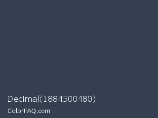 Decimal 1884500480 Color is a dark blue color and the nearest color is Charcoal #36454f. Hex code #344050 and RGB value is rgb(52,64,80). In RGB color space, this color is composed of 20% red, 25% green, 31% blue, In CMYK color space, this color is composed of 35% cyan, 20% magenta, 0% yellow , 69% black , In HSL color space, this color has a hue angle of 214° , 21% saturation and 26% lightness.