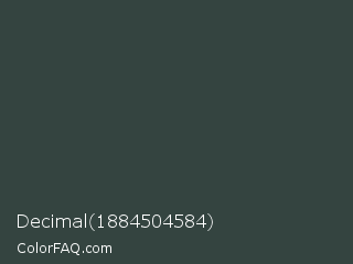 Decimal 1884504584 Color is a dark cyan color and the nearest color is Cape Cod #3c4443. Hex code #344440 and RGB value is rgb(52,68,64). In RGB color space, this color is composed of 20% red, 27% green, 25% blue, In CMYK color space, this color is composed of 24% cyan, 0% magenta, 6% yellow , 73% black , In HSL color space, this color has a hue angle of 165° , 13% saturation and 24% lightness.