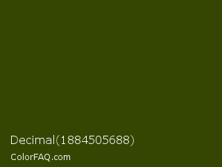 Decimal 1884505688 Color is a very dark lime color and the nearest color is Clover #384910. Hex code #344602 and RGB value is rgb(52,70,2). In RGB color space, this color is composed of 20% red, 27% green, 1% blue, In CMYK color space, this color is composed of 26% cyan, 0% magenta, 97% yellow , 73% black , In HSL color space, this color has a hue angle of 76° , 94% saturation and 14% lightness.