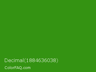 Decimal 1884636038 Color is a normal green color and the nearest color is Slimy Green #299617. Hex code #349312 and RGB value is rgb(52,147,18). In RGB color space, this color is composed of 20% red, 58% green, 7% blue, In CMYK color space, this color is composed of 65% cyan, 0% magenta, 88% yellow , 42% black , In HSL color space, this color has a hue angle of 104° , 78% saturation and 32% lightness.