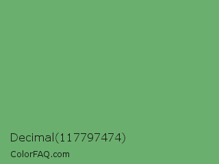 Decimal 117797474 Color is a normal green color and the nearest color is Fern #63b76c. Hex code #6baf6e and RGB value is rgb(107,175,110). In RGB color space, this color is composed of 42% red, 69% green, 43% blue, In CMYK color space, this color is composed of 39% cyan, 0% magenta, 37% yellow , 31% black , In HSL color space, this color has a hue angle of 123° , 30% saturation and 55% lightness.