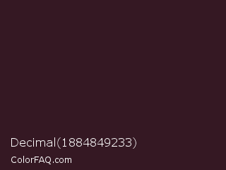 Decimal 1884849233 Color is a very dark rose color and the nearest color is Cocoa Brown #301f1e. Hex code #351823 and RGB value is rgb(53,24,35). In RGB color space, this color is composed of 21% red, 9% green, 14% blue, In CMYK color space, this color is composed of 0% cyan, 55% magenta, 34% yellow , 79% black , In HSL color space, this color has a hue angle of 337° , 38% saturation and 15% lightness.