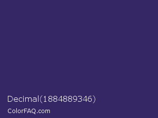 Decimal 1884889346 Color is a dark indigo color and the nearest color is Jacarta #3a2a6a. Hex code #352666 and RGB value is rgb(53,38,102). In RGB color space, this color is composed of 21% red, 15% green, 40% blue, In CMYK color space, this color is composed of 48% cyan, 63% magenta, 0% yellow , 60% black , In HSL color space, this color has a hue angle of 254° , 46% saturation and 27% lightness.