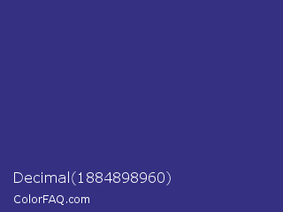 Decimal 1884898960 Color is a normal indigo color and the nearest color is Cosmic Cobalt #2e2d88. Hex code #353082 and RGB value is rgb(53,48,130). In RGB color space, this color is composed of 21% red, 19% green, 51% blue, In CMYK color space, this color is composed of 59% cyan, 63% magenta, 0% yellow , 49% black , In HSL color space, this color has a hue angle of 244° , 46% saturation and 35% lightness.