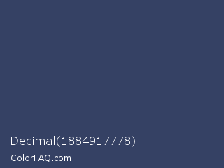 Decimal 1884917778 Color is a dark blue color and the nearest color is Rhino #2e3f62. Hex code #354164 and RGB value is rgb(53,65,100). In RGB color space, this color is composed of 21% red, 25% green, 39% blue, In CMYK color space, this color is composed of 47% cyan, 35% magenta, 0% yellow , 61% black , In HSL color space, this color has a hue angle of 225° , 31% saturation and 30% lightness.