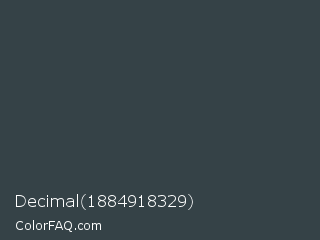 Decimal 1884918329 Color is a dark blue color and the nearest color is Arsenic #3b444b. Hex code #354247 and RGB value is rgb(53,66,71). In RGB color space, this color is composed of 21% red, 26% green, 28% blue, In CMYK color space, this color is composed of 25% cyan, 7% magenta, 0% yellow , 72% black , In HSL color space, this color has a hue angle of 197° , 15% saturation and 24% lightness.