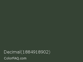 Decimal 1884918902 Color is a dark green color and the nearest color is Kombu Green #354230. Hex code #354334 and RGB value is rgb(53,67,52). In RGB color space, this color is composed of 21% red, 26% green, 20% blue, In CMYK color space, this color is composed of 21% cyan, 0% magenta, 22% yellow , 74% black , In HSL color space, this color has a hue angle of 116° , 13% saturation and 23% lightness.