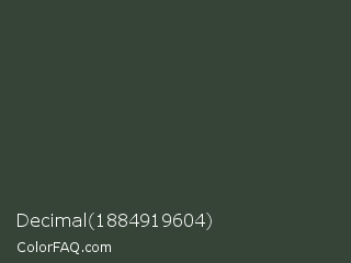 Decimal 1884919604 Color is a dark green color and the nearest color is Kombu Green #354230. Hex code #354436 and RGB value is rgb(53,68,54). In RGB color space, this color is composed of 21% red, 27% green, 21% blue, In CMYK color space, this color is composed of 22% cyan, 0% magenta, 21% yellow , 73% black , In HSL color space, this color has a hue angle of 124° , 12% saturation and 24% lightness.