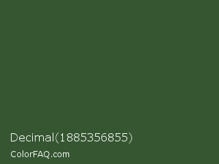 Decimal 1885356855 Color is a dark green color and the nearest color is Mughal Green #306030. Hex code #355631 and RGB value is rgb(53,86,49). In RGB color space, this color is composed of 21% red, 34% green, 19% blue, In CMYK color space, this color is composed of 38% cyan, 0% magenta, 43% yellow , 66% black , In HSL color space, this color has a hue angle of 114° , 27% saturation and 26% lightness.