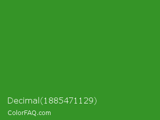 Decimal 1885471129 Color is a normal green color and the nearest color is Slimy Green #299617. Hex code #359427 and RGB value is rgb(53,148,39). In RGB color space, this color is composed of 21% red, 58% green, 15% blue, In CMYK color space, this color is composed of 64% cyan, 0% magenta, 74% yellow , 42% black , In HSL color space, this color has a hue angle of 112° , 58% saturation and 37% lightness.