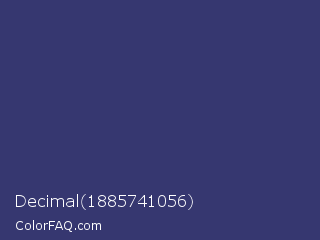 Decimal 1885741056 Color is a normal blue color and the nearest color is Deep Koamaru #333366. Hex code #363770 and RGB value is rgb(54,55,112). In RGB color space, this color is composed of 21% red, 22% green, 44% blue, In CMYK color space, this color is composed of 52% cyan, 51% magenta, 0% yellow , 56% black , In HSL color space, this color has a hue angle of 239° , 35% saturation and 33% lightness.