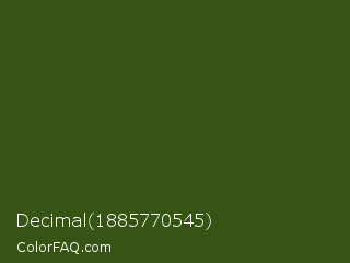 Decimal 1885770545 Color is a very dark green color and the nearest color is Clover #384910. Hex code #365413 and RGB value is rgb(54,84,19). In RGB color space, this color is composed of 21% red, 33% green, 7% blue, In CMYK color space, this color is composed of 36% cyan, 0% magenta, 77% yellow , 67% black , In HSL color space, this color has a hue angle of 88° , 63% saturation and 20% lightness.