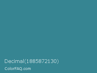 Decimal 1885872130 Color is a normal cyan color and the nearest color is Astral #327da0. Hex code #368592 and RGB value is rgb(54,133,146). In RGB color space, this color is composed of 21% red, 52% green, 57% blue, In CMYK color space, this color is composed of 63% cyan, 9% magenta, 0% yellow , 43% black , In HSL color space, this color has a hue angle of 188° , 46% saturation and 39% lightness.