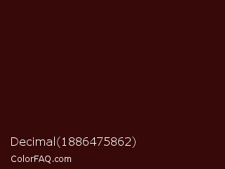 Decimal 1886475862 Color is a very dark red color and the nearest color is Aubergine #3b0910. Hex code #370908 and RGB value is rgb(55,9,8). In RGB color space, this color is composed of 22% red, 4% green, 3% blue, In CMYK color space, this color is composed of 0% cyan, 84% magenta, 85% yellow , 78% black , In HSL color space, this color has a hue angle of 1° , 75% saturation and 12% lightness.