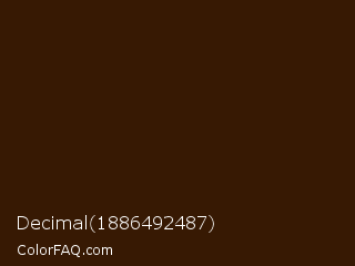 Decimal 1886492487 Color is a very dark orange color and the nearest color is Clinker #371d09. Hex code #371903 and RGB value is rgb(55,25,3). In RGB color space, this color is composed of 22% red, 10% green, 1% blue, In CMYK color space, this color is composed of 0% cyan, 55% magenta, 95% yellow , 78% black , In HSL color space, this color has a hue angle of 25° , 90% saturation and 11% lightness.