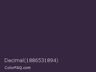 Decimal 1886531894 Color is a very dark purple color and the nearest color is Blackcurrant #32293a. Hex code #372640 and RGB value is rgb(55,38,64). In RGB color space, this color is composed of 22% red, 15% green, 25% blue, In CMYK color space, this color is composed of 14% cyan, 41% magenta, 0% yellow , 75% black , In HSL color space, this color has a hue angle of 279° , 25% saturation and 20% lightness.