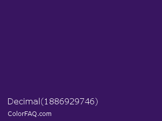 Decimal 1886929746 Color is a dark violet color and the nearest color is Scarlet Gum #431560. Hex code #381560 and RGB value is rgb(56,21,96). In RGB color space, this color is composed of 22% red, 8% green, 38% blue, In CMYK color space, this color is composed of 42% cyan, 78% magenta, 0% yellow , 62% black , In HSL color space, this color has a hue angle of 268° , 64% saturation and 23% lightness.
