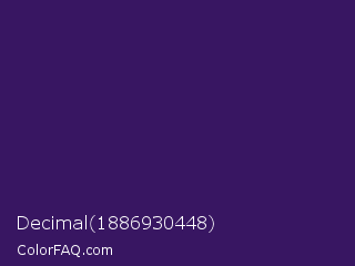 Decimal 1886930448 Color is a dark violet color and the nearest color is Scarlet Gum #431560. Hex code #381662 and RGB value is rgb(56,22,98). In RGB color space, this color is composed of 22% red, 9% green, 38% blue, In CMYK color space, this color is composed of 43% cyan, 78% magenta, 0% yellow , 62% black , In HSL color space, this color has a hue angle of 267° , 63% saturation and 24% lightness.