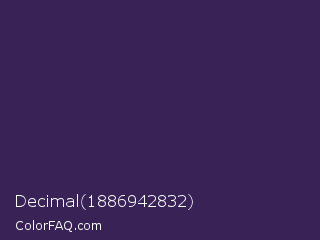Decimal 1886942832 Color is a dark violet color and the nearest color is Deep Grape #381a51. Hex code #382256 and RGB value is rgb(56,34,86). In RGB color space, this color is composed of 22% red, 13% green, 34% blue, In CMYK color space, this color is composed of 35% cyan, 60% magenta, 0% yellow , 66% black , In HSL color space, this color has a hue angle of 265° , 43% saturation and 24% lightness.