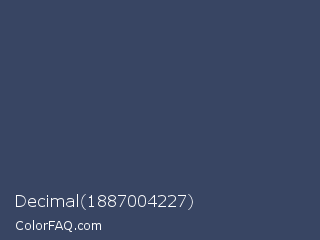 Decimal 1887004227 Color is a dark blue color and the nearest color is Rhino #2e3f62. Hex code #384563 and RGB value is rgb(56,69,99). In RGB color space, this color is composed of 22% red, 27% green, 39% blue, In CMYK color space, this color is composed of 43% cyan, 30% magenta, 0% yellow , 61% black , In HSL color space, this color has a hue angle of 222° , 28% saturation and 30% lightness.
