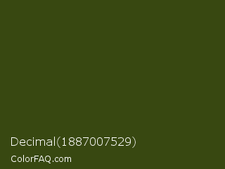 Decimal 1887007529 Color is a very dark lime color and the nearest color is Clover #384910. Hex code #384811 and RGB value is rgb(56,72,17). In RGB color space, this color is composed of 22% red, 28% green, 7% blue, In CMYK color space, this color is composed of 22% cyan, 0% magenta, 76% yellow , 72% black , In HSL color space, this color has a hue angle of 77° , 62% saturation and 17% lightness.