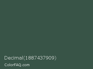 Decimal 1887437909 Color is a dark green color and the nearest color is Dark Slate Gray #2f4f4f. Hex code #385447 and RGB value is rgb(56,84,71). In RGB color space, this color is composed of 22% red, 33% green, 28% blue, In CMYK color space, this color is composed of 33% cyan, 0% magenta, 15% yellow , 67% black , In HSL color space, this color has a hue angle of 152° , 20% saturation and 27% lightness.