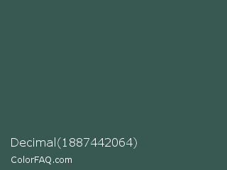 Decimal 1887442064 Color is a dark cyan color and the nearest color is Stromboli #325d52. Hex code #385852 and RGB value is rgb(56,88,82). In RGB color space, this color is composed of 22% red, 35% green, 32% blue, In CMYK color space, this color is composed of 36% cyan, 0% magenta, 7% yellow , 65% black , In HSL color space, this color has a hue angle of 169° , 22% saturation and 28% lightness.