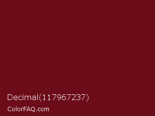 Decimal 117967237 Color is a dark red color and the nearest color is Dark Tan #661010. Hex code #6c0c19 and RGB value is rgb(108,12,25). In RGB color space, this color is composed of 42% red, 5% green, 10% blue, In CMYK color space, this color is composed of 0% cyan, 89% magenta, 77% yellow , 58% black , In HSL color space, this color has a hue angle of 352° , 80% saturation and 24% lightness.