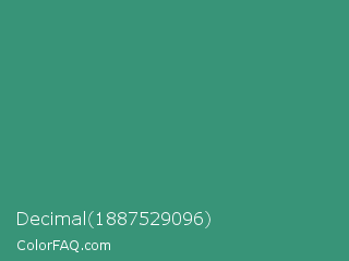 Decimal 1887529096 Color is a normal green color and the nearest color is Illuminating Emerald #319177. Hex code #389478 and RGB value is rgb(56,148,120). In RGB color space, this color is composed of 22% red, 58% green, 47% blue, In CMYK color space, this color is composed of 62% cyan, 0% magenta, 19% yellow , 42% black , In HSL color space, this color has a hue angle of 162° , 45% saturation and 40% lightness.