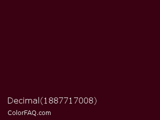 Decimal 1887717008 Color is a very dark rose color and the nearest color is Temptress #3b000b. Hex code #390112 and RGB value is rgb(57,1,18). In RGB color space, this color is composed of 22% red, 0% green, 7% blue, In CMYK color space, this color is composed of 0% cyan, 98% magenta, 68% yellow , 78% black , In HSL color space, this color has a hue angle of 342° , 97% saturation and 11% lightness.