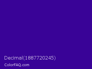 Decimal 1887720245 Color is a dark violet color and the nearest color is Blue Gem #2c0e8c. Hex code #390397 and RGB value is rgb(57,3,151). In RGB color space, this color is composed of 22% red, 1% green, 59% blue, In CMYK color space, this color is composed of 62% cyan, 98% magenta, 0% yellow , 41% black , In HSL color space, this color has a hue angle of 262° , 96% saturation and 30% lightness.