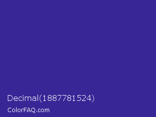 Decimal 1887781524 Color is a normal indigo color and the nearest color is Blue Pigment #333399. Hex code #392696 and RGB value is rgb(57,38,150). In RGB color space, this color is composed of 22% red, 15% green, 59% blue, In CMYK color space, this color is composed of 62% cyan, 75% magenta, 0% yellow , 41% black , In HSL color space, this color has a hue angle of 250° , 60% saturation and 37% lightness.