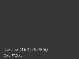 Decimal 1887797908 Color is a very dark red color and the nearest color is Dune #383533. Hex code #393636 and RGB value is rgb(57,54,54). In RGB color space, this color is composed of 22% red, 21% green, 21% blue, In CMYK color space, this color is composed of 0% cyan, 5% magenta, 5% yellow , 78% black , In HSL color space, this color has a hue angle of 0° , 3% saturation and 22% lightness.