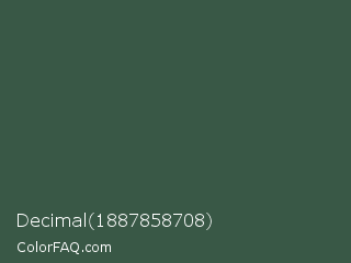 Decimal 1887858708 Color is a dark green color and the nearest color is Tom Thumb #3f583b. Hex code #395846 and RGB value is rgb(57,88,70). In RGB color space, this color is composed of 22% red, 35% green, 27% blue, In CMYK color space, this color is composed of 35% cyan, 0% magenta, 20% yellow , 65% black , In HSL color space, this color has a hue angle of 145° , 21% saturation and 28% lightness.