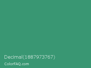 Decimal 1887973767 Color is a normal green color and the nearest color is Illuminating Emerald #319177. Hex code #399773 and RGB value is rgb(57,151,115). In RGB color space, this color is composed of 22% red, 59% green, 45% blue, In CMYK color space, this color is composed of 62% cyan, 0% magenta, 24% yellow , 41% black , In HSL color space, this color has a hue angle of 157° , 45% saturation and 41% lightness.