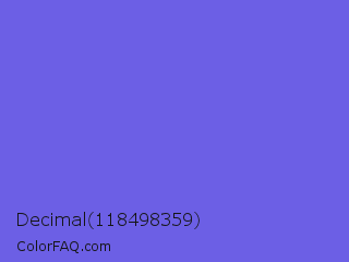 Decimal 118498359 Color is a light indigo color and the nearest color is Medium Slate Blue #7b68ee. Hex code #6c5fe5 and RGB value is rgb(108,95,229). In RGB color space, this color is composed of 42% red, 37% green, 90% blue, In CMYK color space, this color is composed of 53% cyan, 59% magenta, 0% yellow , 10% black , In HSL color space, this color has a hue angle of 246° , 72% saturation and 64% lightness.