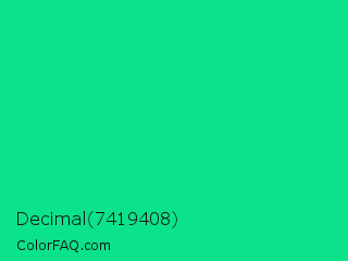 Decimal 7419408 Color is a normal green color and the nearest color is Caribbean Green #00cc99. Hex code #0ae38a and RGB value is rgb(10,227,138). In RGB color space, this color is composed of 4% red, 89% green, 54% blue, In CMYK color space, this color is composed of 96% cyan, 0% magenta, 39% yellow , 11% black , In HSL color space, this color has a hue angle of 155° , 92% saturation and 46% lightness.
