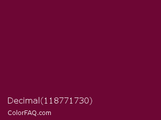 Decimal 118771730 Color is a dark rose color and the nearest color is Black Rose #67032d. Hex code #6d0634 and RGB value is rgb(109,6,52). In RGB color space, this color is composed of 43% red, 2% green, 20% blue, In CMYK color space, this color is composed of 0% cyan, 94% magenta, 52% yellow , 57% black , In HSL color space, this color has a hue angle of 333° , 90% saturation and 23% lightness.
