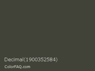 Decimal 1900352584 Color is a dark yellow color and the nearest color is Armadillo #433e37. Hex code #424338 and RGB value is rgb(66,67,56). In RGB color space, this color is composed of 26% red, 26% green, 22% blue, In CMYK color space, this color is composed of 1% cyan, 0% magenta, 16% yellow , 74% black , In HSL color space, this color has a hue angle of 65° , 9% saturation and 24% lightness.