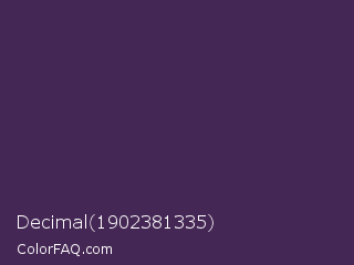 Decimal 1902381335 Color is a dark purple color and the nearest color is Bossanova #4e2a5a. Hex code #452755 and RGB value is rgb(69,39,85). In RGB color space, this color is composed of 27% red, 15% green, 33% blue, In CMYK color space, this color is composed of 19% cyan, 54% magenta, 0% yellow , 67% black , In HSL color space, this color has a hue angle of 279° , 37% saturation and 24% lightness.