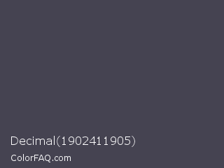 Decimal 1902411905 Color is a dark indigo color and the nearest color is Mako #444954. Hex code #454351 and RGB value is rgb(69,67,81). In RGB color space, this color is composed of 27% red, 26% green, 32% blue, In CMYK color space, this color is composed of 15% cyan, 17% magenta, 0% yellow , 68% black , In HSL color space, this color has a hue angle of 249° , 9% saturation and 29% lightness.