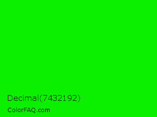 Decimal 7432192 Color is a normal green color and the nearest color is Green #00ff00. Hex code #0af000 and RGB value is rgb(10,240,0). In RGB color space, this color is composed of 4% red, 94% green, 0% blue, In CMYK color space, this color is composed of 96% cyan, 0% magenta, 100% yellow , 6% black , In HSL color space, this color has a hue angle of 118° , 100% saturation and 47% lightness.